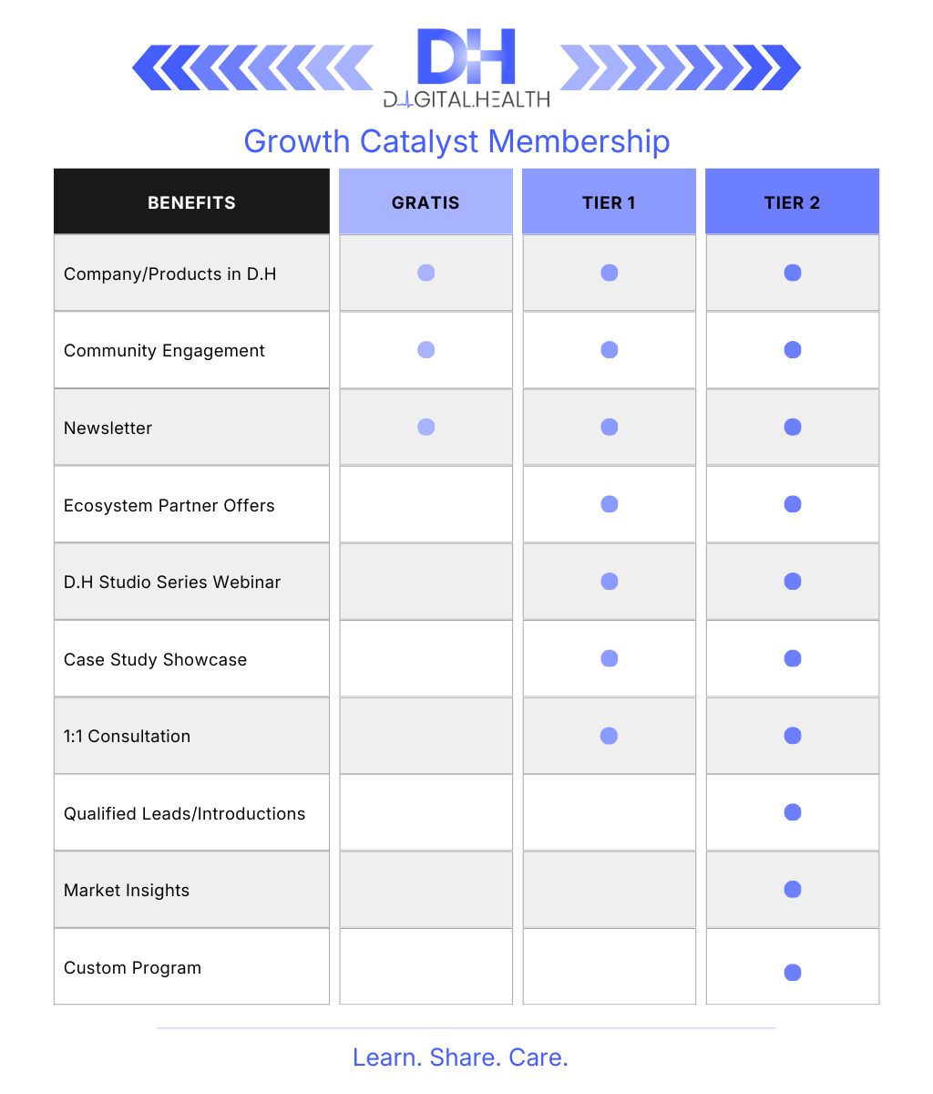 The Digital.Health Growth Catalyst program empowers digital health, AI, tech, and pharma companies to expand market reach and meaningfully engage healthcare decision-makers. We create value by connecting stakeholders across the healthcare ecosystem and serving as the bridge that supports the adoption and scaling of digital health and AI technologies.